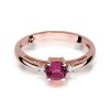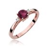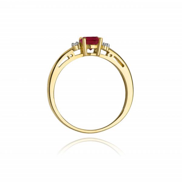 Inel Aur 14 K cu Rubin 0.60ct, Diamante 0.03 ct Piatra centrala: Rubin 0.60ct Pietre laterale: 2 Diamante de 0.015 carate, Culoare H, Claritate Si2 Greutate: 2.50 gr – 2.90 gr Latimea sinei: aprox. 1.70mm Inaltimea coroanei: 4.9 mm Inelul vine insotit de Certificat de Calitate si Conformitate si cutie profesionala cadou.
